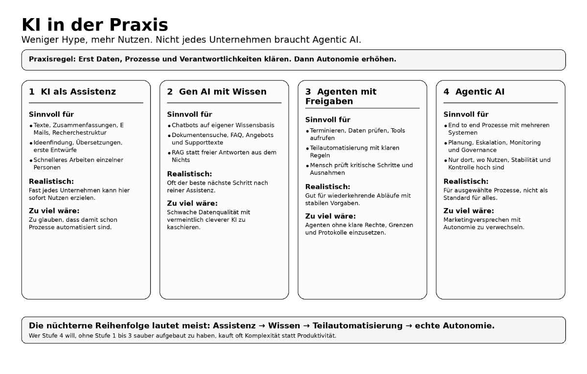 Diese Reihenfolge wirkt unspektakulär, ist aber betriebswirtschaftlich vernünftig. Sie reduziert Fehlentscheidungen, schafft Vertrauen im Team und ermöglicht messbaren Nutzen in einzelnen Stufen. Wer dagegen sofort auf Agentic AI setzt, ohne die Vorstufen sauber aufgebaut zu haben, investiert schnell in Architektur, Integrationen und Steuerungslogik, bevor der eigentliche Nutzen belegt ist.